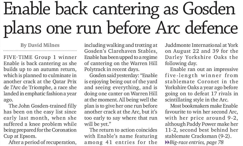 Not yet entered for the Arc but that seems a formality given she's the raging favourite and still improving. Second favourite Almanzor hasn't even raced this season let alone at a mile and a half, while third favourite 3yo Brametot is also yet to race beyond 2100m. Enable could jump off the shortest priced favourite for many years. Currently around 2/1 at best and that looks most generous.