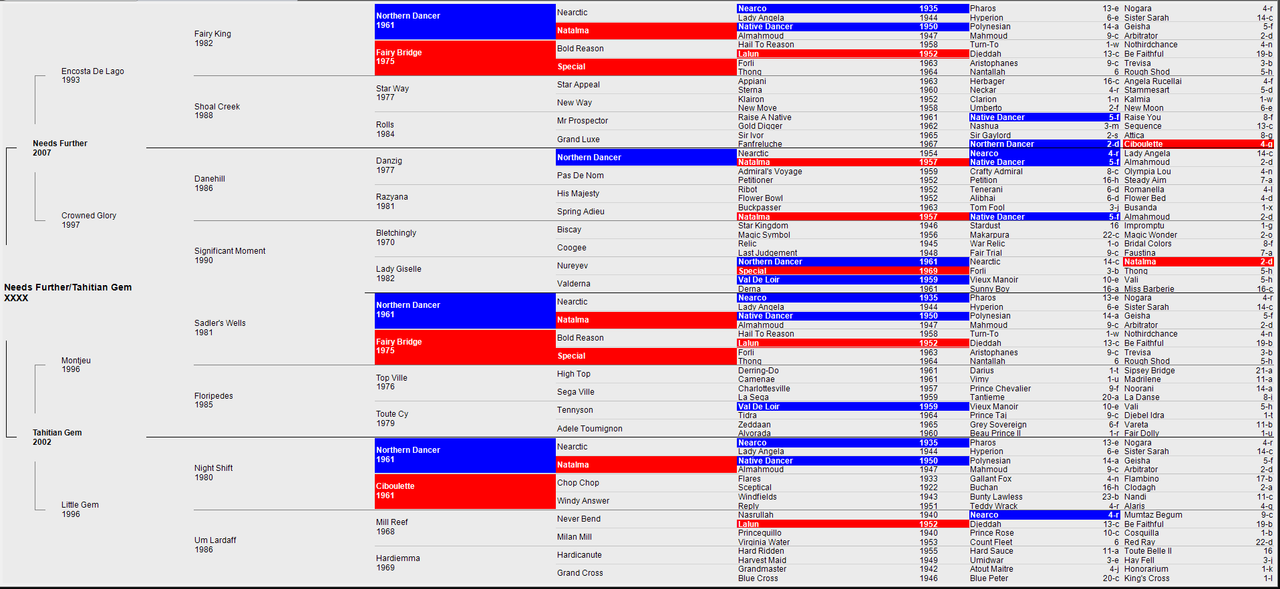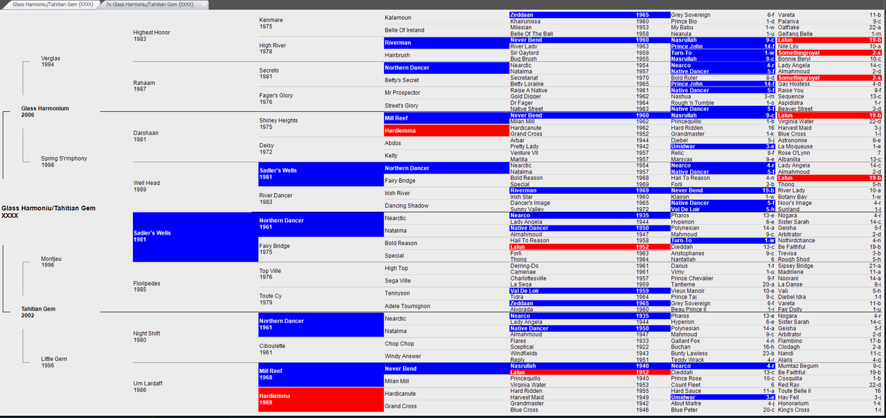 even I'm living on the "other site of the world". I'm so free to swuggest some mating . I was a bit wondering, why Pentire wasn't mentioned yet. Well, he was bred in AUS/NZ (not quite sure the exact contry). On paper the mating looks good. Pentire -Tahitian Gem 4x4 Hardiemma or 2x3 Gull Nook/Um Lardaff 3/4 relatives, 5x6x6 Never Bend/Bold Reason Yes , I know he is deceased now, maybe he has a son at Stud. A Germanbred Sire standinhg in AUS: Lucas Cranach-Tahitian Gem 3x5 Shirley Hights/Um Lardaff, 4x5x5 ND Here are som more "suggestions", but probably not possible, on the other hand, with so many Horses imported to AUS there is at least a small Chance, they will find the way "Down Under". Konigstiger-Tahitian Gem 3x3 Gull Nook/Um Lardaff 3/4 rel. or 4x5 Hardiemma, 3x4 Sadlers Wells (sadly deceased) Adlerflug-Tahitian Gem 3x4 Shirley Heights/Um Lardaff FB/FS, 3x3 Sadlers Wells, 4x4x5 Mill Reef, 4x4x4x5 ND Dashing Blade-Tahitian Gem 3x3 Shirley Heights/Um Lardaff FB/FS, dam 4x4 ND Lord of England (son of Dashing Blade)-Tahitian Gem 3x4 Shirley Heights/Um Lardaff, dam 4x4 ND Reliable Man-Tahitian Gem 3x4 Shirley Heights/Um Lardaff FB/FS, 3x3 Sadlers Wells4x4x4 ND Dubawi-Tahitian Gem 3x4 Shirley Heights/Um Lardaff FB/FS, 4x5x5 ND Hope I could give some clues. regards, Ticino Lucas Cranach |