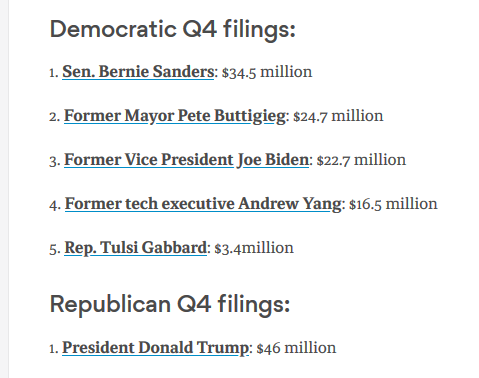 Mayor Pete who is surging in polling and in funds raised is a 37yo whipper snapper. He is considered the front-runner in the early Primaries/caucus in most polls Elizabeth Warren hasn't declared her funds yet but is struggling. ![]() |