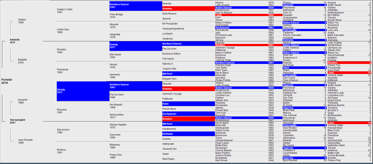 btw, it's the first time I see an Australian ped with the Germanbred Sire "Birkhahn" duplicated 5x7 via Galileo-Allegretta-Almyra-Birkhahn and Starspangled-Slip Anchor-Sayonara-Birkhahn regards, Ticino