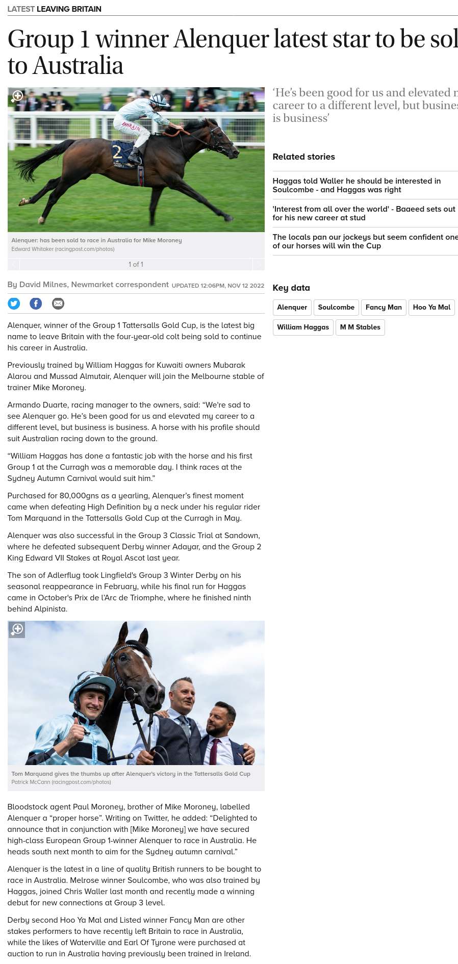 After two Australian flops, highly rated import Alenquer will be gelded in a bid to help him find his best form over spring. Trainer Mike Moroney said the operation will take place on Friday and then he will be spelled. "We'll get him gelded, give him a spell and bring him back for the spring," Moroney said. |