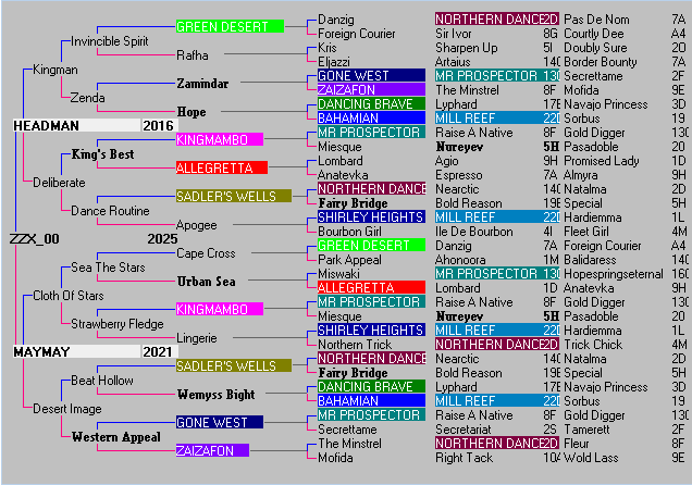This filly foal born 17/05/25 has Green Desert (m), producing two sons - not good for a colt or a filly foal. Kingmambo (m), producing a son and daughter - good for a colt foal. Allegretta (f), producing a son and daughter - good for a filly foal. Sadler's Wells (m) producing a daughter and son - good for a colt foal. Gone West (m), producing a son and daughter - good for a colt foal. Zaizafon (f), producing a son and daughter - good for a filly foal. Dancing Brave (m), producing a daughter (Hope) and a daughter (Wemyss Bight) - good for a filly foal. Bahamian (f), producing a daughter and a daughter - perhaps extra stamina? Shirley Heights (m), producing a daughter and a daughter - good for a filly foal. There is a daughter of Northern Dancer (m) to offset his many sons. You might notice that the sire Mill Reef (m) produces two sons and two daughters - good for a colt foal. Zamindar (m) and Western Appeal (f) are full sibling brother and sister - good for a colt or filly foal. Hope (f) and Wemyss Bight (f) are full sibling sisters. - good for a colt or filly foal. |