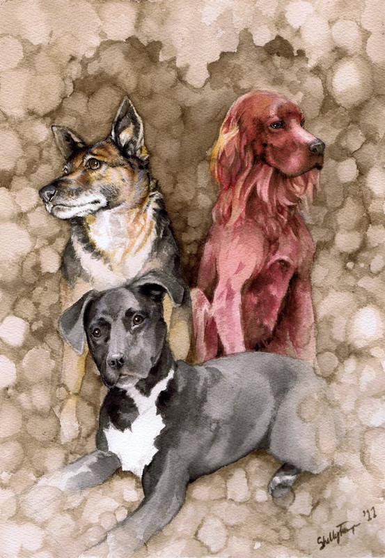 That's a picture of my three dogs prior to Elvis. Smokey as a youngster and the part heeler at the back is Coal (the childrens pet when growing up - he rounded them up on multiple occasions) and the red setter Baron we only had for four years before a throat cancer killed him. Each had a personality. Baron was goofy but when my eldest wandered the fields up on the farm he was with her. She'd disappear and I'd look out the window and there she would be off on an adventure with Baron by her side. He also bought up some wild kittens who ended up the gentlest cat I ever knew. A case of nurture over nature.