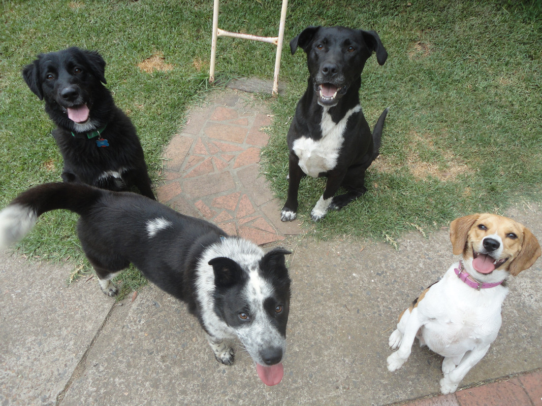 Pip (Kats dog prior to Gemma) and Smokey at the back and Gooba and Bella at the front. The family dogs visited with their owners. Gooba and Bella are still alive although both are closing on 14 years one.