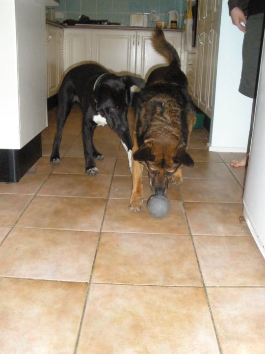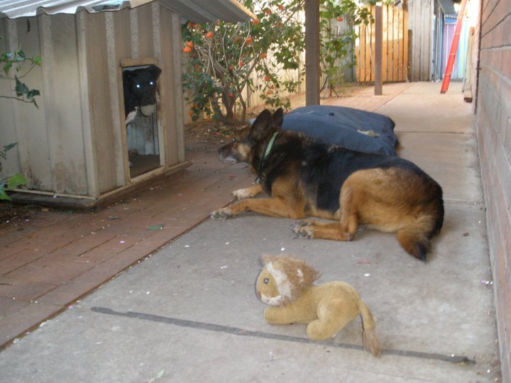 Smokey as a pup with old boy Coal. THis would happen quite alot. Smokey loved to nip Coal on his hind legs and Coal would put him in his place - the old kennel.