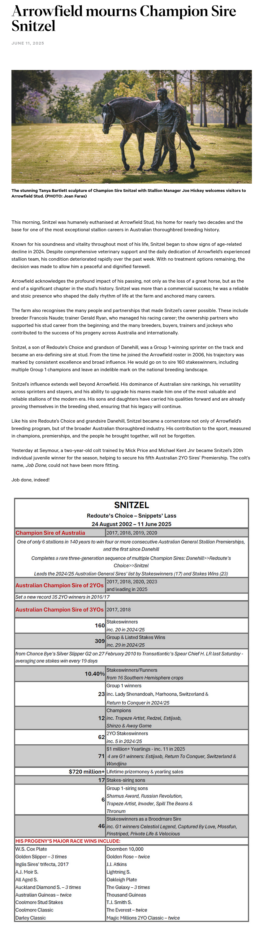 Lucky you VSP. I am just proud to have been lucky enough to pat him . Cant recall a time being at Arrowfield when he wasnt there. He looked terrible last stallion parade weekend so I am surprised he lasted this long really. What a great Australian horse. Very sad day . I remember his breeder telling us how he was skint the year Snitzel was a yearliing and so he sold him, to his ever lasting regret. Feel so sad . R I P Champ.