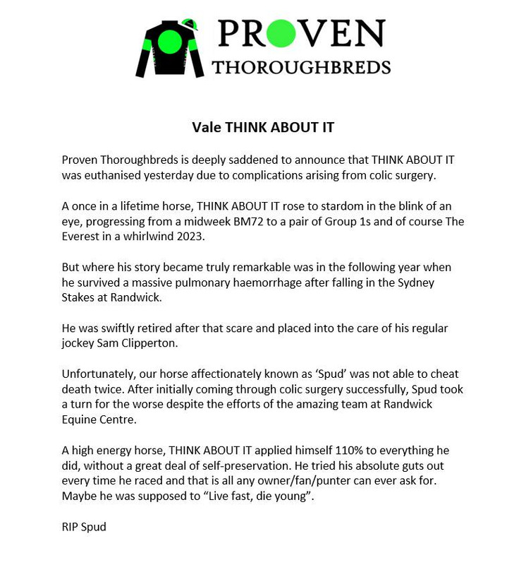 Thanks aa. It really p1sses me off that keyboard warriors spread bullsh1t without providing facts. If you can’t prove it, keep your suspicions to yourself and shut the f up ![]() I have no doubt the horse was given the best care, every day AND when he became ill. Randwick Equine are among the best in the business and I don’t believe for one minute that connections would’ve let him suffer. Colic remains the no. 1 killer of horses. You can give them the best care and it can still strike, anytime. A horse can be fine in the morning, gone by noon. And surgery can’t always save them. Anyone who knows horses knows that colic is the C word. RIP Spud. Condolences to his people